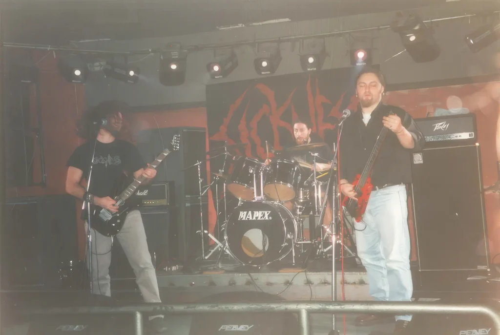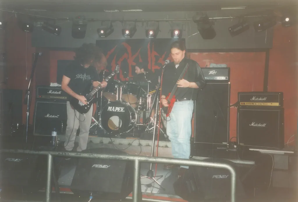 At some point, because at that time the internet didn’t exist yet and things were generally more human, which means that we went out without fear, we went to shops, to squares and we knew a lot of kids who shared the same love for metal, wanting to express ourselves further by playing too, or at least trying, on one of our outings I met the person who was going to create the band that would be my first more professional effort in the Greek underground, that is, the Greek metal scene. Nikos played drums and already had a death metal band with another guitarist, but he agreed to come and play in some of our rehearsals in our thrash – speed – power group, because he generally liked playing with bands from the Greek scene. The rest is more or less known to fans of the Greek underground and I will briefly mention my subsequent career, without going into too many details. In 1994, Nikos and I created the underground Death Metal band “Sickness” with me as guitarist, singer and composer and Nikos as drummer and lyricist mainly, because I have also written lyrics for a few Sickness songs, but most of them are his.